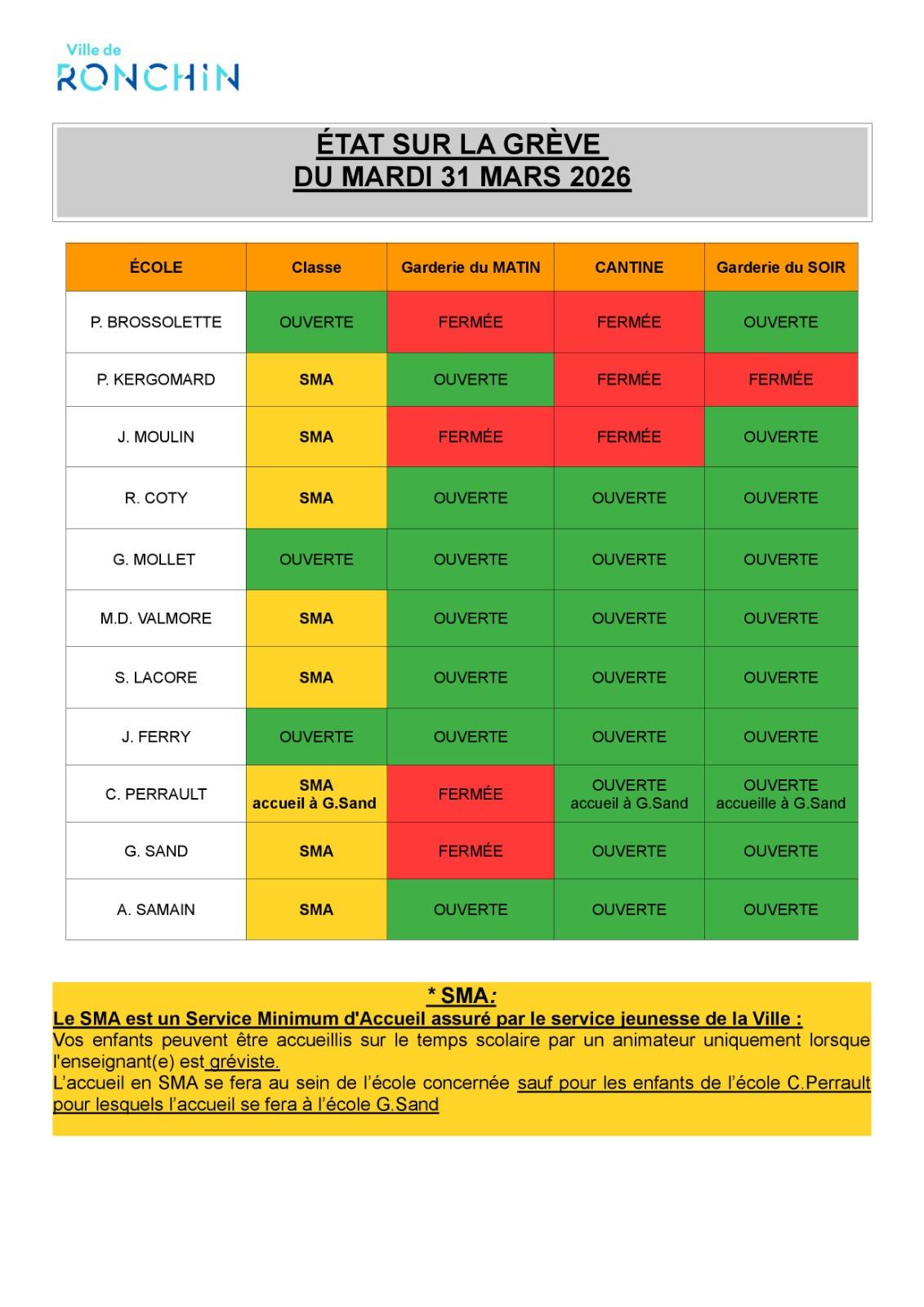 Ce mardi 31 mars, le mouvement de grève impactera les écoles ronchinoises, au niveau des garderies et des cantines, ainsi qu'au niveau du temps scolaire.